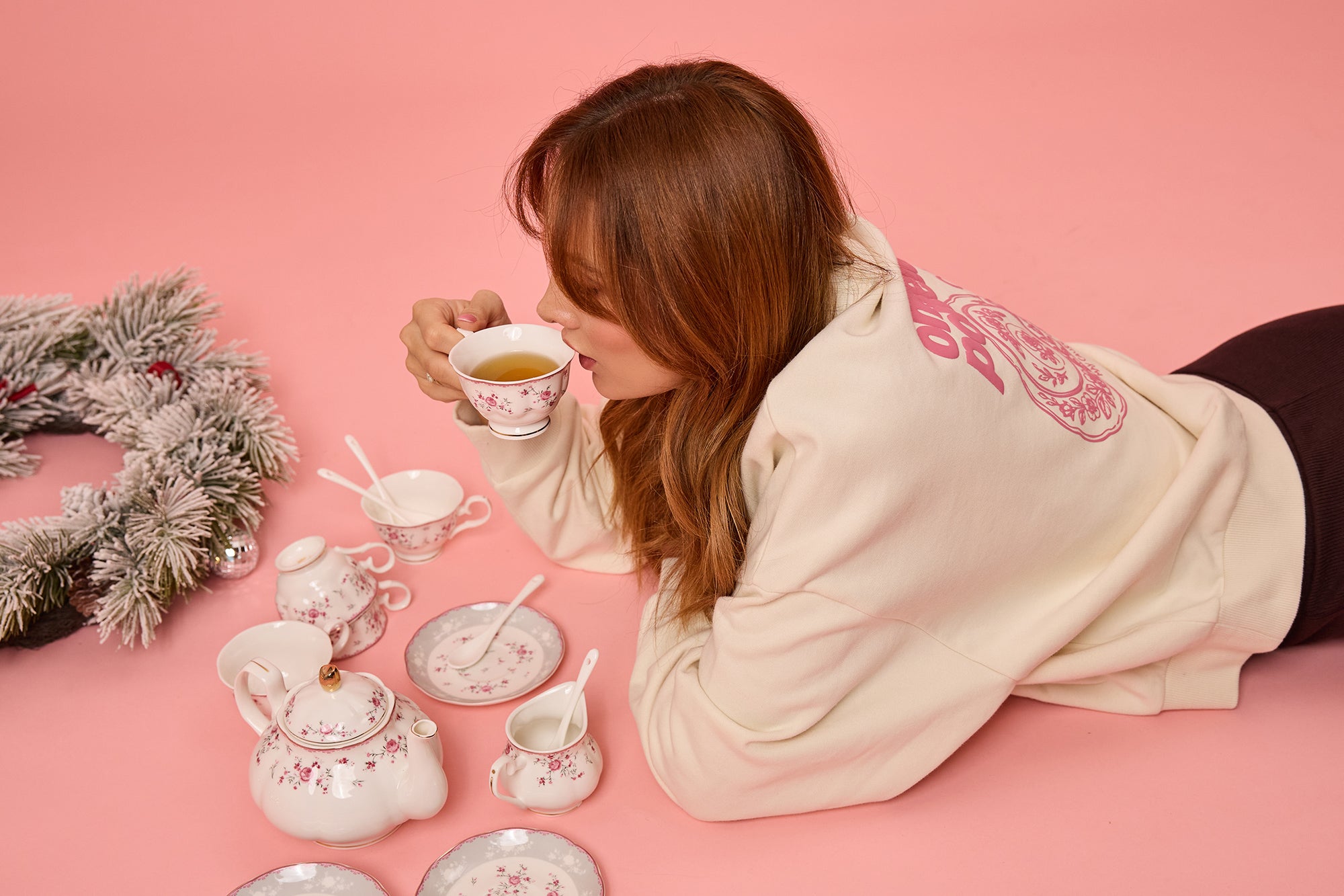 Martini-Gläser klirren, Blümchen-Porzellan glänzt, Hände tauchen in Teig.